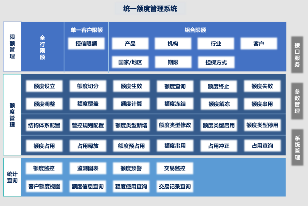 构建全行涉及额度所有业务的集中管理体系,给予统一的额度处理服务、统一的风险管控策略、标准的信息交互规范,给予全行信贷资产业务的额度全视图。